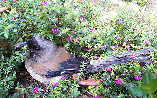 真的是一隻不小的鳥,蹲在哪。因為公司門口是條小巷子,左右停了車後,差不多一輛車可通過,牠蹲的位置,有很高的被輾過的機率,連忙進公司拿個東西來移置牠到一旁的公園